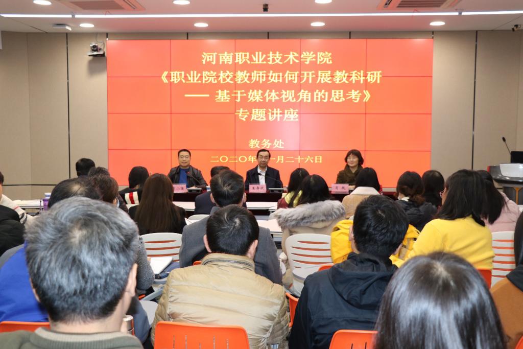 11月26日下午,我校在明知楼一楼精品智慧教室举办“职业院校教师如何开展教科研—基于媒体视角的思考”专题讲座,浙江永嘉学院副院长、苏州工业园区职业技术学院党委副书记王寿斌教授应邀来学校做专题讲座。副校长肖珑、各教学单位及相关职能部门共70余人参加了报告会。会议由教务处处长李小强主持。