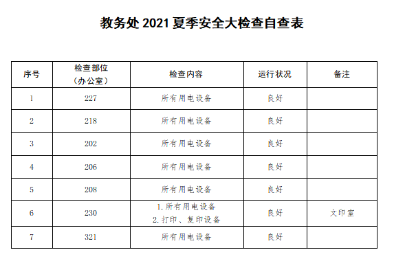 2.重点复查。6月28日至7月初,教务处领导和消防安全联系人对本处各科室进行认真复查,重点检查各办公室内各类用电设备和容易引起火灾的隐患点和风险点。