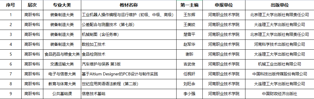 6月30日,教育部办公厅公布了《教育部办公厅关于公布首批“十四五”职业教育国家规划教材书目的通知》,河南职院9种教材名列其中,教材入选数量在省高职院校中位列前茅,这是学院继获得首届国家优秀教材奖后的又一重大成果,也是学院 “双高”建设重大标志性成果。