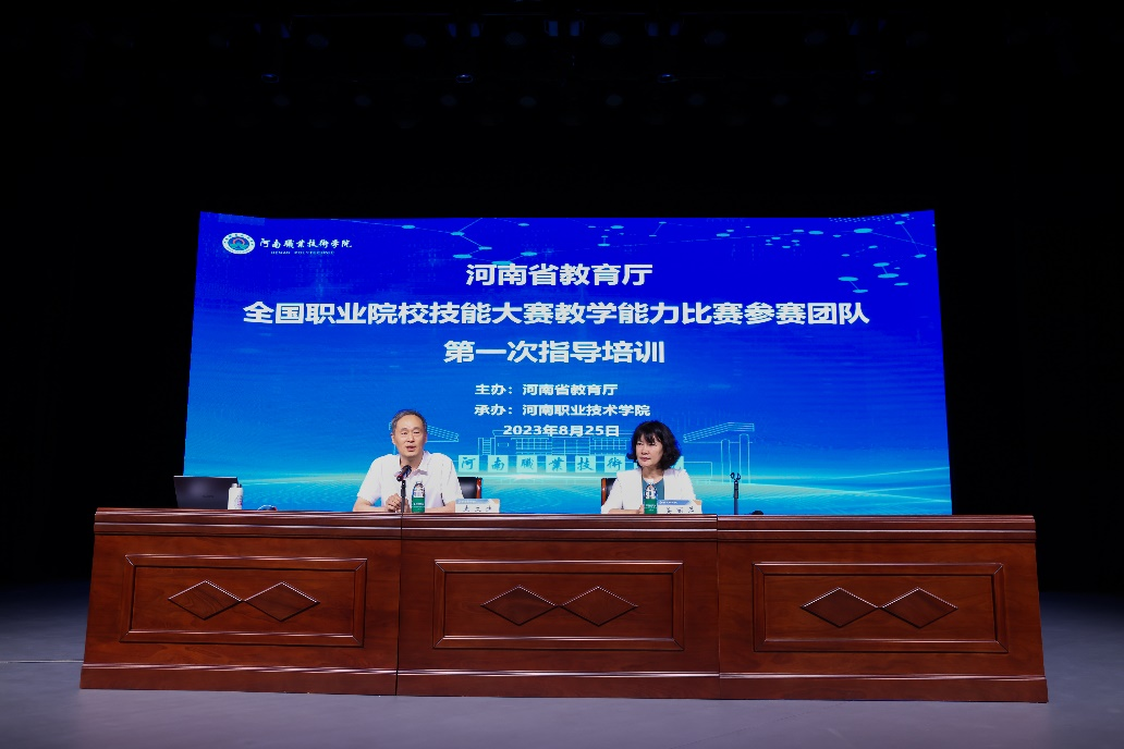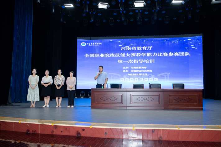 2023年8月25日,由河南省教育厅主办,2003网站太阳集团承办的河南省教育厅全国职业院校技能大赛教学能力比赛参赛团队第一次指导培训在河南职院音乐厅举行。河南省教育厅职业教育与成人教育处副处长史文生出席培训会并讲话,全省26所中高职院校及共计260余人参会。