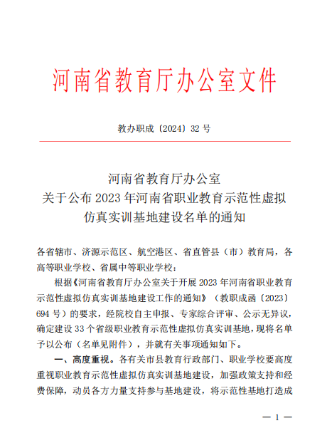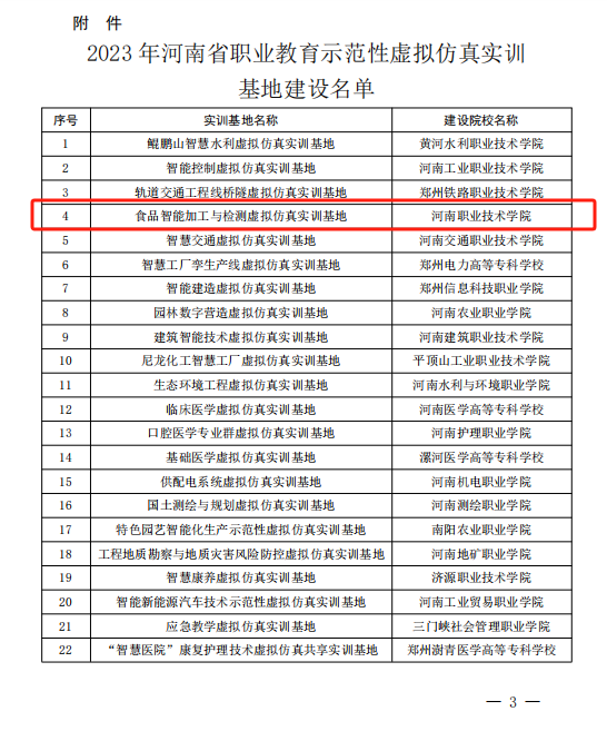 近日,河南省教育厅公布了2023年河南省职业教育示范性虚拟仿真实训基地建设单位名单(教办职成〔2024〕32号),学校申报的“食品智能加工与检测虚拟仿真实训基地”成功入选。截止目前,学校共建有国家级职业教育示范性虚拟仿真实训基地1个,省级职业教育示范性虚拟仿真实训基地4个。