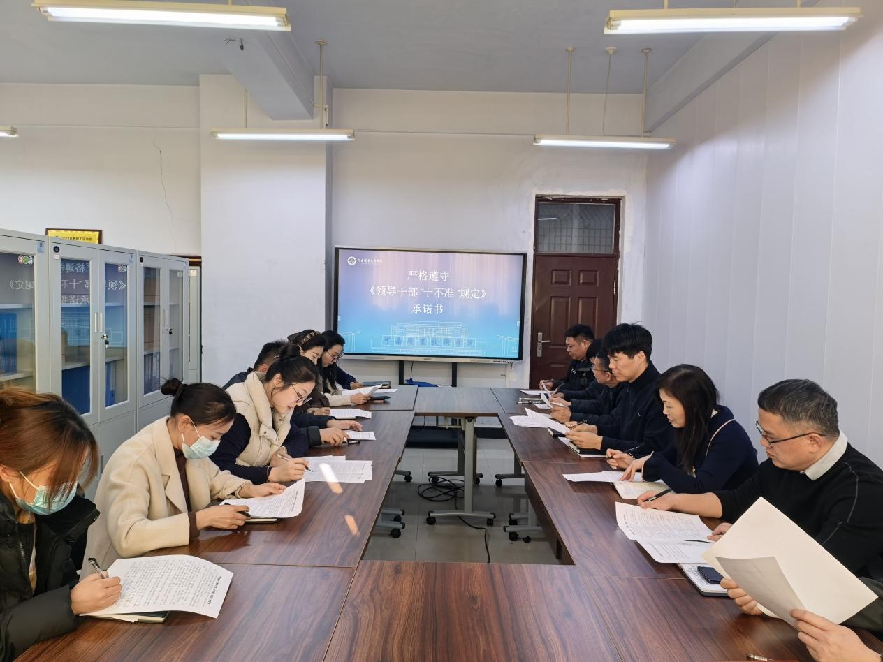 承诺践诺显担当。为强化学习成效与责任落实,教务处组织全体成员签署《严格遵守〈领导干部“十不准”规定〉承诺书》。承诺书既是对照规定作出的庄严宣誓,更是对组织、对师生的郑重承诺。此举进一步增强了干部的纪律观念与责任意识,推动大家将外在约束转化为内在追求。